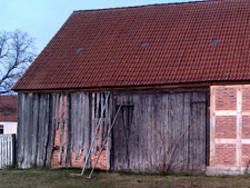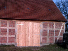 Fachwerkscheune mit Holzschalung: links alter Zustand, rechts neuer Zustand