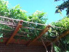 Interessante Oberlichtgestaltung, rechts eine Pergola mit verzierten Balkenköpfen